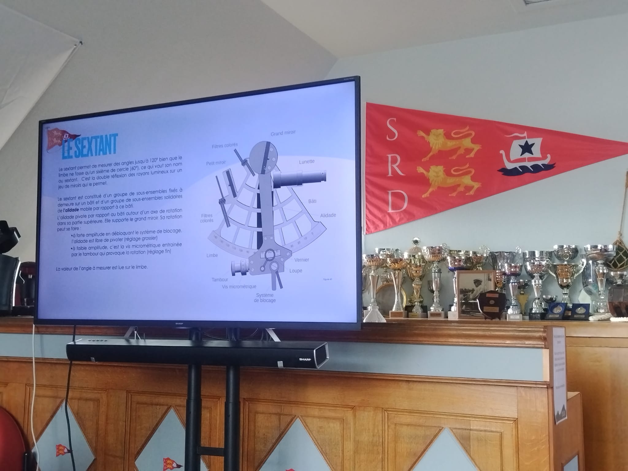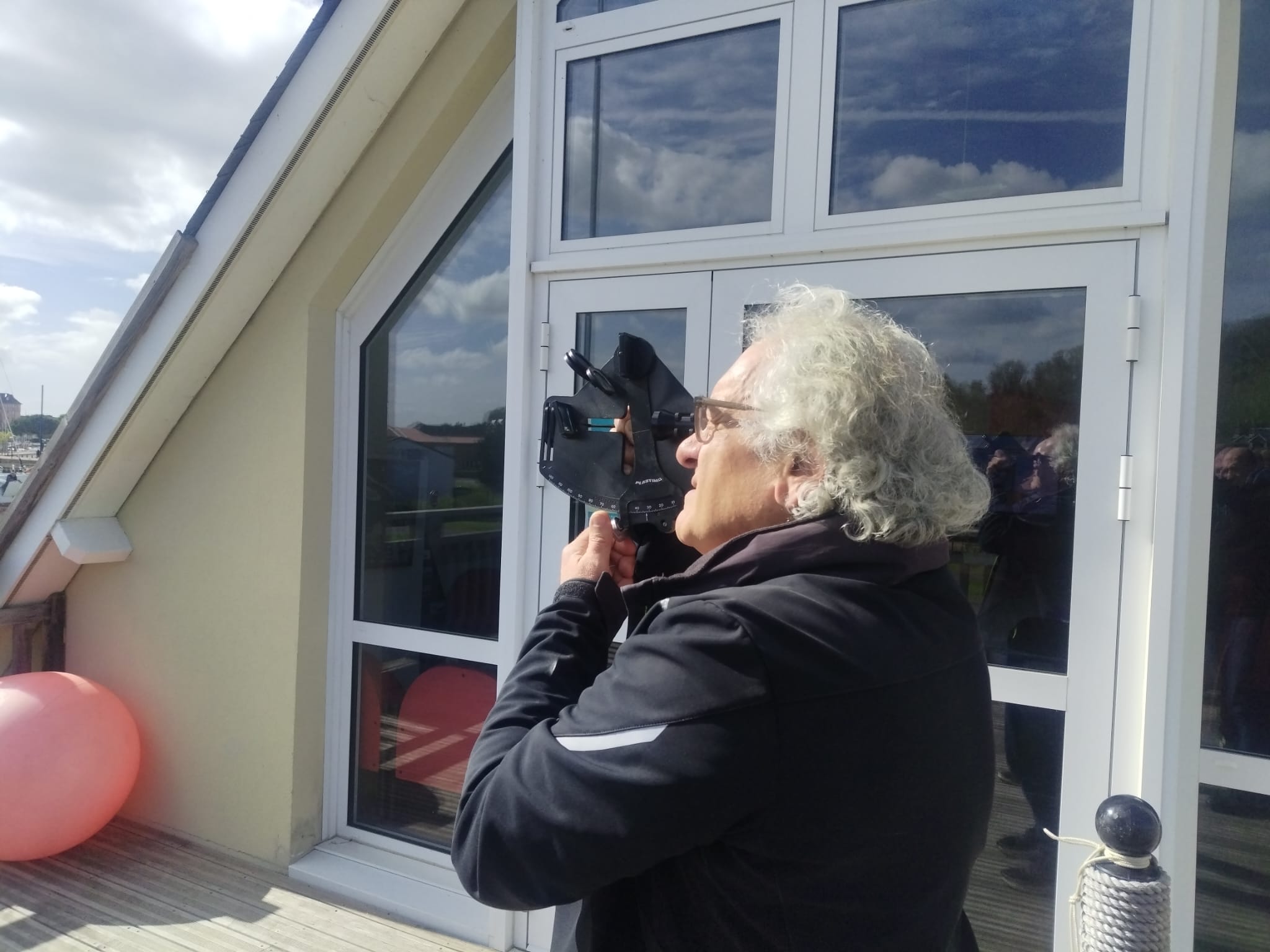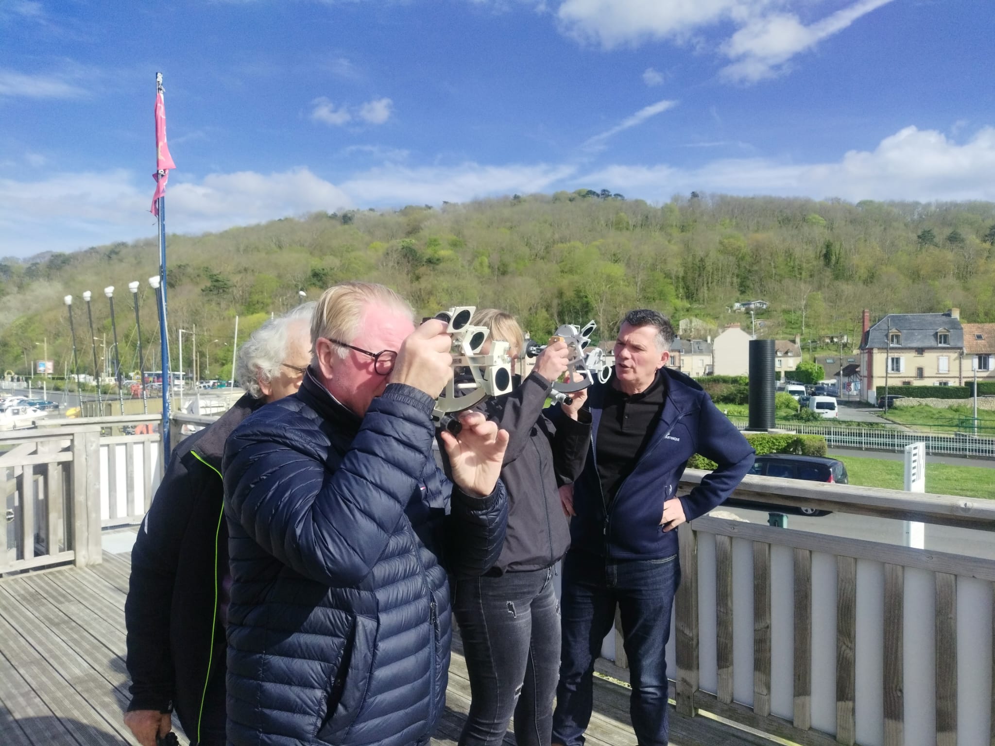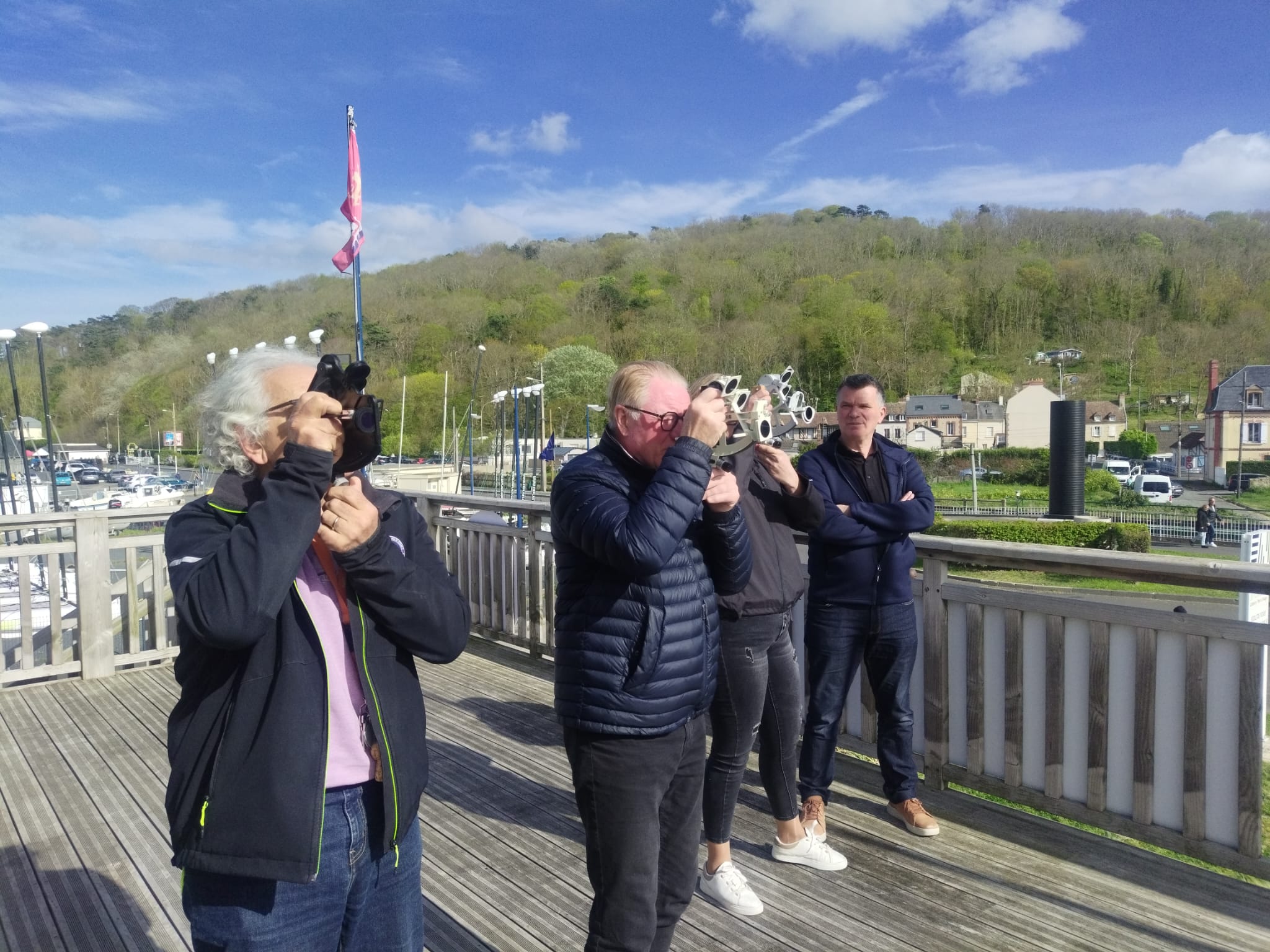 Ce samedi 11 avril, la dernière séance du cycle de formation à la NAVIGATION ASTRONOMIQUE s’est tenue. Le sextant, sa manipulation et son utilisation n’ont plus de secret pour les participants. Le soleil ayant bien voulu assurer une présence lumineuse en cette fin d’après-midi, la terrasse du club a remplacé le pont d’un bateau, les relevés de hauteur ont pu se faire. Les résultats de toutes les mesures sont convergents et concluants, le club-house est bien situé sur le port, à Dives , en Normandie !